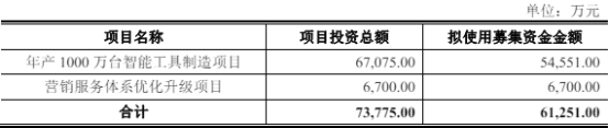 大艺科技原拟在深交所主板刊行股数不普及36,479,642股。公司原拟召募资金61,251.00万元,辞别用于年产1000万台智能器具制造技俩、营销就业体系优化升级技俩。