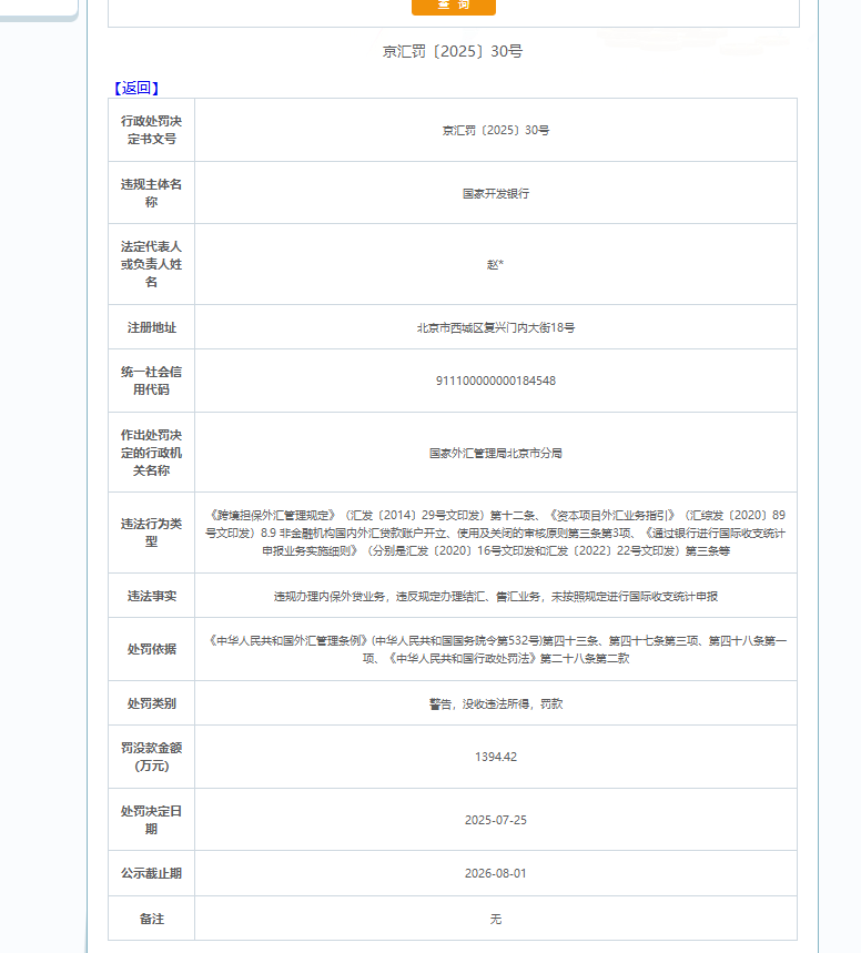 2025年8月2日,国度外汇贬责局北京市分局公布了一则处罚信息(京汇罚〔2025〕30号),国度建树银行总行因违纪办理内保外贷业务,违背轨则办理结汇、售汇业务,未按照轨则进行海出门入统计讲演,被给以劝诫,处东谈主民币1394.42万元的罚没款。
